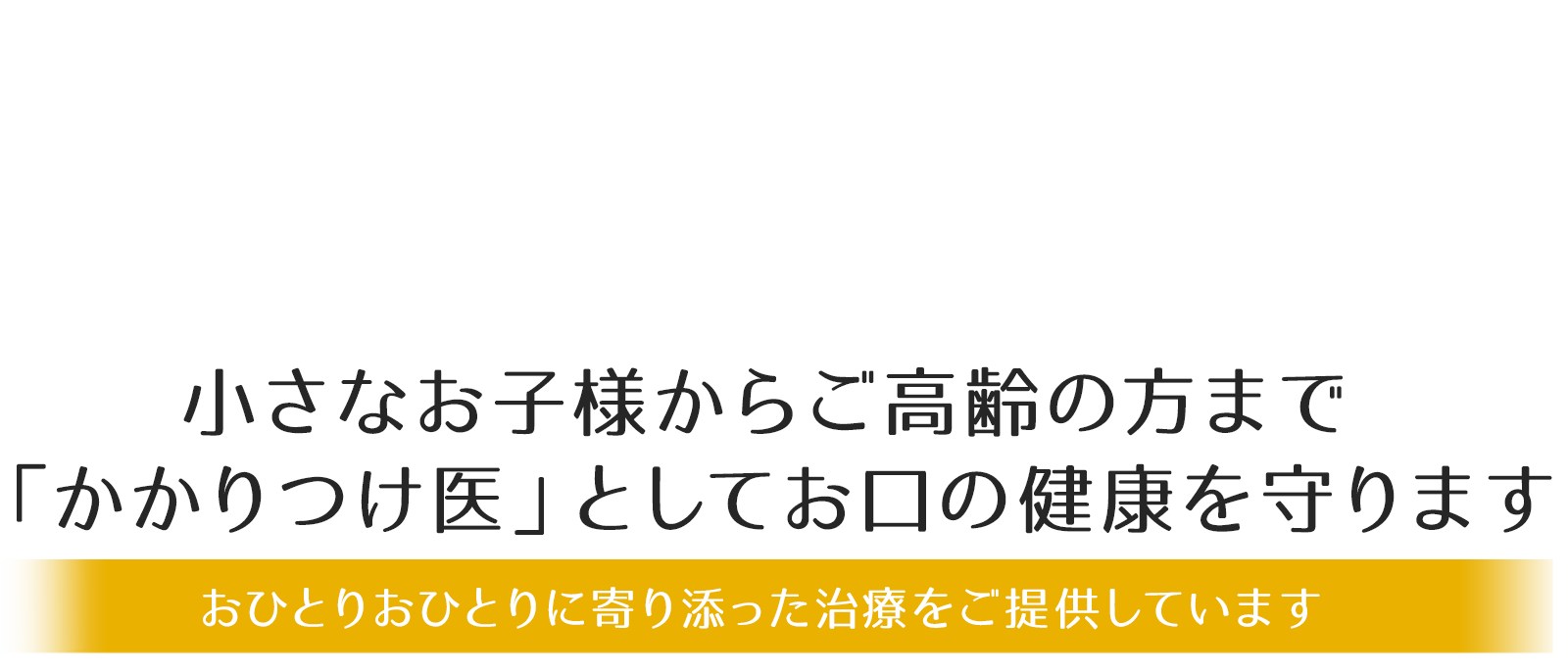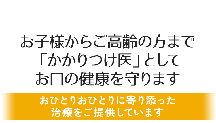 お子さまからご高齢の方まで幅広い世代にとっての「かかりつけ医」として、地域の皆様のお口の健康を見守ります。むし歯や歯周病の治療だけでなく、予防や定期的なチェックを通じて、いつまでも快適に食べ、笑顔で過ごせるようサポートいたします。